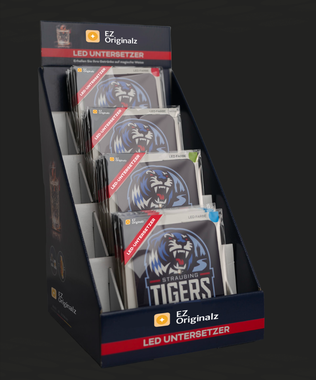 Präsentieren Sie Ihre LED-Untersetzer in einem Aufsteller–Display. Ideal für Vereine und Unternehmen, die unsere Untersetzer ansprechend auslegen oder zum Weiterverkauf anbieten möchten.