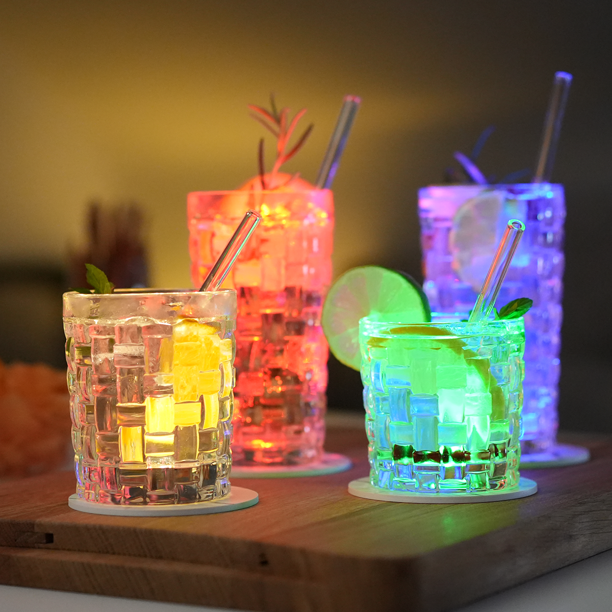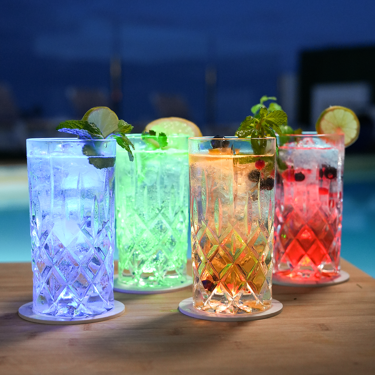 Die Beleuchtung unserer Untersetzer aktiviert sich automatisch, sobald ein Glas auf den Untersetzer gestellt wird, und erlischt, wenn das Glas entfernt wird. Diese Funktion wird durch einen Drucksensor ausgelöst.